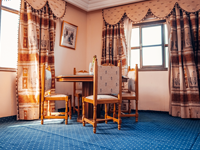 Les suites mesurent 60 mètres carrés. Grande chambre avec un lit queen ou king size. Décor élégant et luxueux avec ses riches étoffes. La suite présidentielle comprend son salon avec canapé et fauteuils.